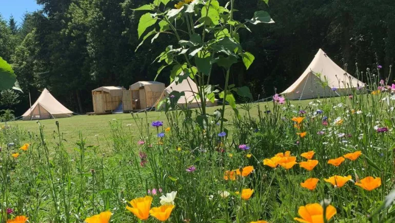 Les six magnifiques tentes cloches sont équipées d'un poêle à bois, d'une cuisine complète et d'une salle de bain écologique privée avec eau chaude solaire et toilettes à compostage.